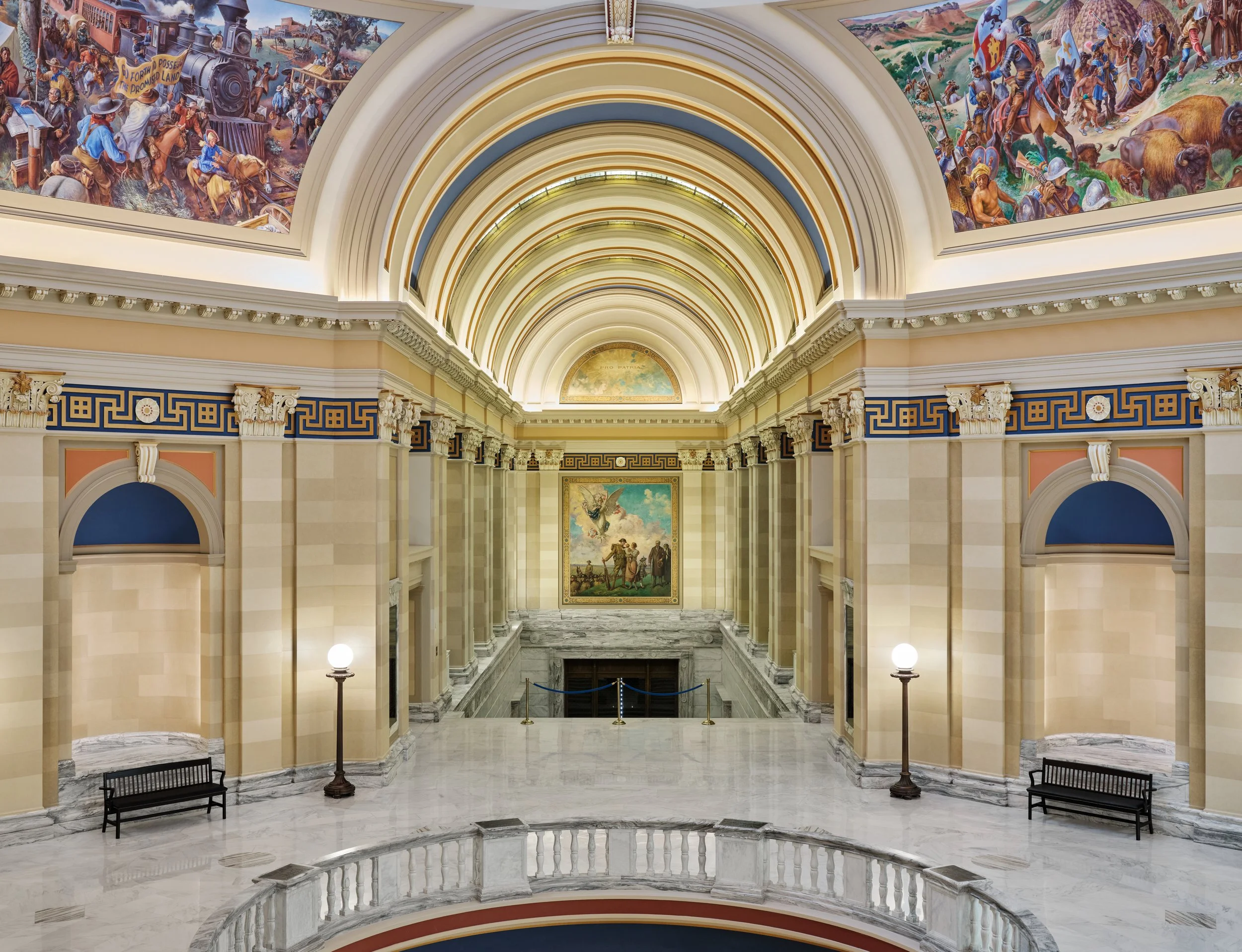 In addition to our work on the existing structure, EPS was responsible for all interior and exterior stonework at the new South Plaza and Visitor Entrance. As visitors cross the South Plaza and descend into the entry, they encounter custom-installed granite paving, granite site walls, and limestone veneer that frame the transition from exterior to interior. Once inside, the entry opens to a dramatic marble floor, culminating in a one-of-a-kind inlaid map of Oklahoma with each county precisely cut from marble and assembled like a puzzle as you enter into the Capitol Building.